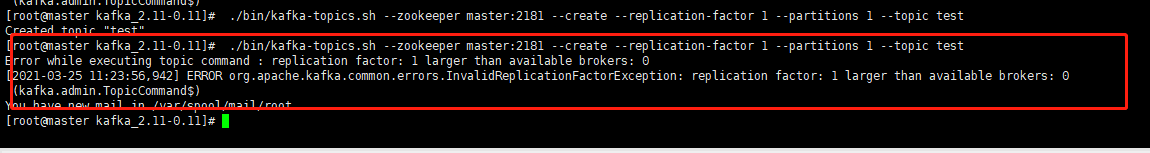 备注:如果报错以下则说明是kafka的后台进程没有开,org.apache.kafka.common.errors.InvalidReplicationFactorException: replication factor: 1 larger than available brokers: 0