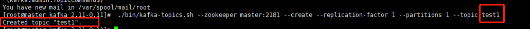 ./bin/kafka-topics.sh --create --zookeeper master:2181, slave1:2181, slave1:2181 --replication-factor 3 --partitions 3 --topic test