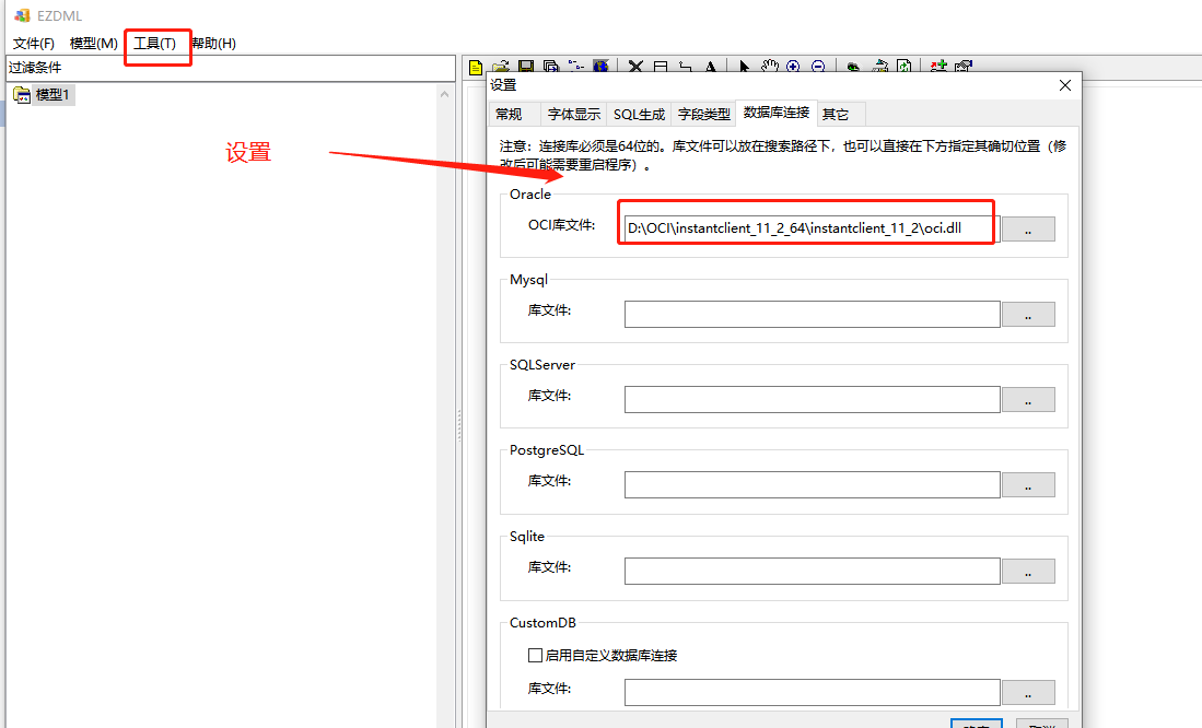 1.首先进行ini文件配置,如果电脑安装了navicat,就用navicat里面的oci.dll文件,因为EZDML运行也需要客户端 可以直接引用那vicat(plsql可能是32位的,所以无法直接用plsql的)