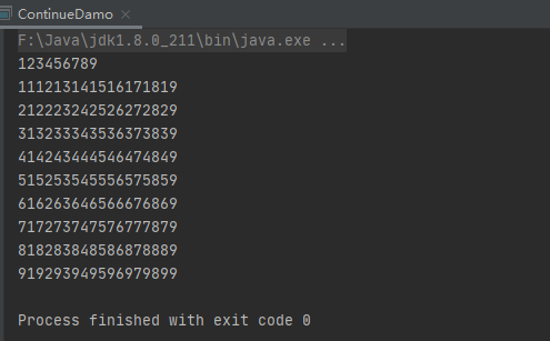 package com.wx.scanner; public class ContinueDamo { public static void main(String[] args) { int i=0; while(i<100){ i++; if(i%10==0){ System.out.println(); continue; } System.out.print(i); } } }