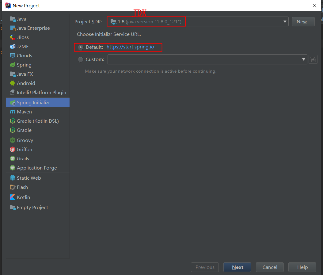 第一步:File ->New -> Project(选择Spring Initializr,jdk选择自己项目环境合适的版本,springboot初始化工具地址默认就好)