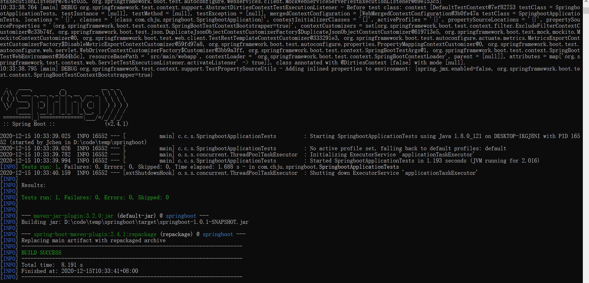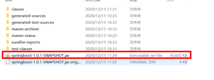 在.jar文件的目录下打开dos窗口执行 java -jar springboot-1.0.1-SNAPSHOT.jar文件发现项目启动成功