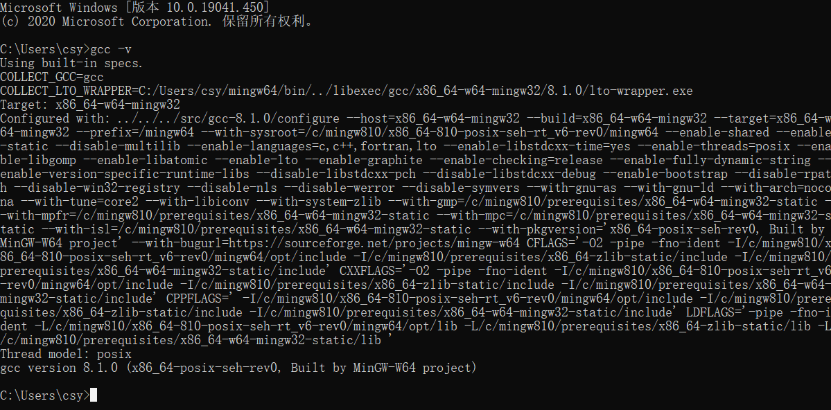 安装完成后,将目录下的/bin目录添加进环境变量后,打开cmd,执行gcc -v看看是否安装成功,如果看到版本号,说明安装成功了!下图是安装成功时的样子: