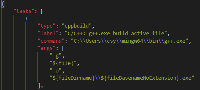 其中tasks.json时告诉vscode怎么构建这个程序的,他会调用gcc/g++编译器创建一个可执行文件。如图中args的参数所示。