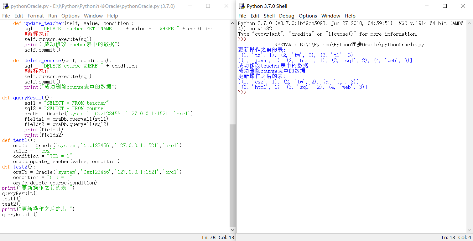 3.建立python函数,查询对teacher和course表进行数据更新操作前后的结果。