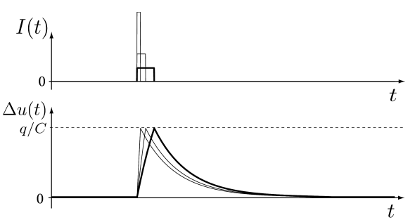 \[u(\Delta)=u_{rest}+RI_0\frac{\Delta}{\tau_m}\quad\text{for}\quad\Delta\ll\tau_m\tag{1.3} \]现在让 \(\Delta\) 越来越短,同时增加电流的幅度到 \(I_0=q/\Delta\) ,以至于 \(\int I(t)dt=q\) 保持不变。