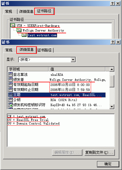如果您想全面体验 WoSign 品牌 SSL证书产品,您可以免费申请有效期为一个月的超快SSL试用证书和超真SSL试用证书,SGC超真SSL 没有试用证书。免费试用证书同样支持所有浏览器和各种服务器软件。 超快SSL试用证书所有性能和技术参数同正式产品 - 超快SSL 一样,超真SSL试用证书所有性能和技术参数同正式产品 - 超真SSL 一样。 请注意以下几点: (1) WoSign 仅 对免费试用证书提供有限的技术支持,请参考“技术支持”栏目: SSL证书请求文件(CSR)生成指南 和 SSL证书安装指南 ; 如果您在申请和安装过程中遇到任何问题,可以发邮件到: (2) WoSign 不保证 免费试用证书的颁发时间,一般在一个工作日内颁发。试用证书一旦颁发,则会发送到申请时填写的电子邮箱中,请经常查收您的电子邮箱,并确保电子邮箱工作正常; (3) WoSign 不验证 您申请免费试用证书时填写的任何信息,但请务必在生成CSR时按要求填写真实信息,否则 WoSign不会颁发免费试用证书。 请比较超真SSL试用证书与正式产品-超真SSL 的不同,如下图所示: