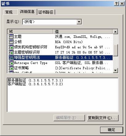 最后是如何识别支持强制 128 位加密的 SGC 超真 SSL 证书,以 IE 7 为例,先点击地址栏右边的安全锁标志,再点击“查看证书”,再点击“详细信息”,往下找到“增强型密钥用法”,如下图 5 所示,一般的不支持 SGC 强制 128 位加密的 SSL 证书只有“服务器验证”和“客户端验证”两个用法,如下图 6 所示,而支持 SGC 强制 128 位加密的 SSL 证书除了有“服务器验证”和“客户端验证”两个用法,还有一个或两个“未知密钥用法”,同时请注意只能是“未知密钥算法 (2.16.840.1.113730.4.1)” 和 / 或 “ 未知密钥算法 ( 1.3.6 .1.4.1.311.10.3.3)” ,有这两个密钥算法的 SSL 证书才是支持 SGC 强制 128 位加密的 SSL 证书。 WoSign品牌的“SGC超真SSL”、VeriSign品牌的“Secure Site Pro”、Thawte品牌的“SGC SuperCerts”都属于支持强制 128 位加密的 SGC 超真 SSL 证书。 请注意:由于用户使用的浏览器版本可能是支持 40 位、 56 位、 128 位等加密长度,所以,要保证 100% 用户都能实现高强度加密的话,一定要选择部署支持 SGC 强制 128 位加密技术的 SSL 证书,因为 40 位的加密强度几秒钟就能破解, 56 位也只需要几天时间。如果您的网站部署的是不支持 SGC 强制 128 位加密技术的 SSL 证书,则一定要提醒用户使用支持 128 位加密的浏览器 ( 如: IE 7 或升级后的 IE 6) 。
