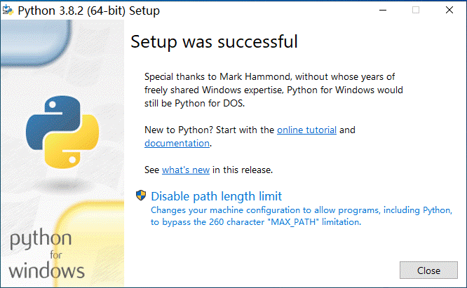 9.出现图示Python3.8.2....,最后有>>>,说明安装已经成功了。