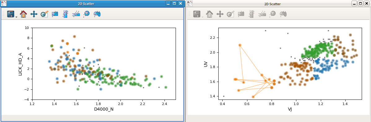 一旦我们开始研究Glue中的数据,就可以清楚地看到位于UVJ图右上角的更红的星系与另一图中显示较旧星系的点对齐。 D4000与Hδ的关系图显示出反相关关系,因此根据我们所看到的,具有更强4000埃破裂和较弱Hδ吸收线强度的星系会显得更老。我们知道此数据是使用光谱学获得的,即查看某物中每个元素吸收或释放的光的波长并将这些波长分离成光谱以确定其组成,我们可以肯定它比其他方法更准确。