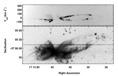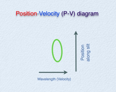 上图中的顶部图是一个p-v图,下图是从p-v图得到的天体图像。摄谱仪狭缝的位置在图像中为一条穿过星云的线。p-v图的水平位置对应于沿着狭缝的位置,竖直位置对应于由谱线的多普勒频移确定的沿着视线的速度。通常p-v图中,水平方向为速度,竖直方向为位置,这是惯例。