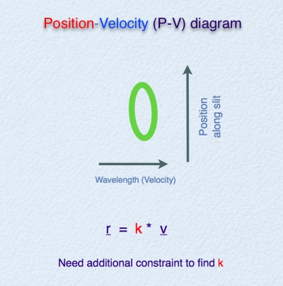 如果我们取出单独的一条线,垂直方向为狭缝,水平方向为波长,那么我们就得到了p-v图,这里,波长便宜被沿视线方向的等效速度代替。