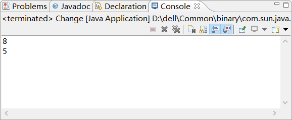 package work; public class Change { /** * @param args */ public static void main(String[] args) { // TODO Auto-generated method stub int x=5; int y=8; int z; z=y; y=x; x=z; System.out.println(x); System.out.println(y); } }