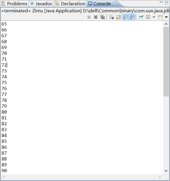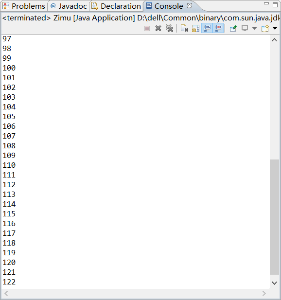 package work; public class Zimu { /** * @param args */ public static void main(String[] args) { // TODO Auto-generated method stub for(char a='A';a<='Z';a++) System.out.println((int) a); for(char b='a';b<='z';b++) System.out.println((int) b); } }