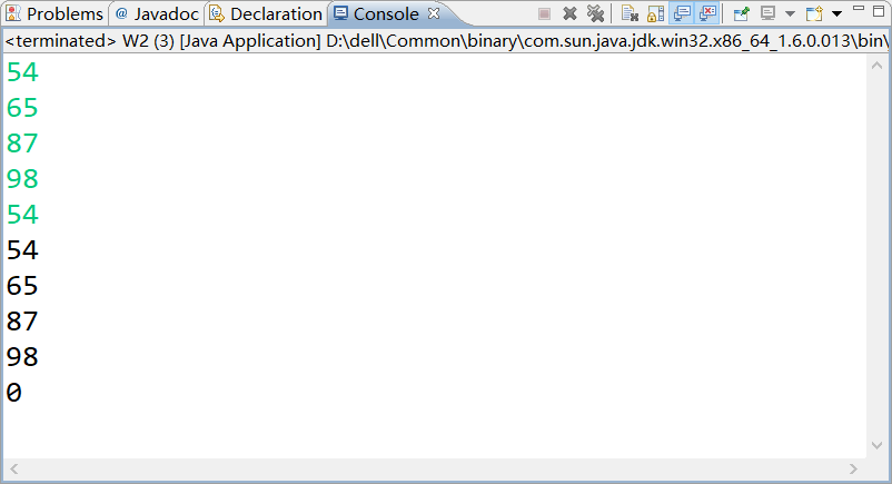 package week8; import java.util.Scanner; public class W2 { /** * @param args */ public static void main(String[] args) { // TODO Auto-generated method stub int a[]=new int [5]; Scanner input=new Scanner(System.in); for (int i = 0; i < a.length; i++) { a[i]=input.nextInt(); } for (int i = 0; i < a.length; i++) { for (int j = i+1; j < a.length; j++) { if(a[i]==a[j]&&a[i]!=0) { a[j]=0; } } } for (int i = 0; i < a.length; i++) { System.out.println(a[i]); } } }