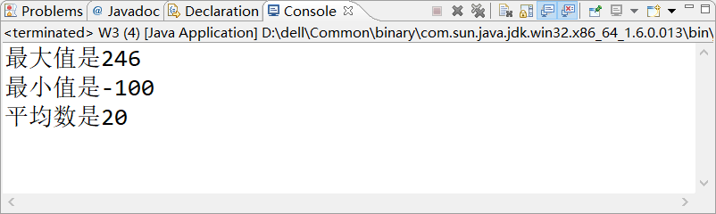 package week8; public class W3 { /** * @param args */ public static void main(String[] args) { // TODO Auto-generated method stub int a[]={-10,2,3,246,-100,0,5}; int max=0; int min=0; int sum=0; for (int i = 0; i < a.length; i++) { if (a[i]>max) { max=a[i]; } if (a[i]<min) { min=a[i]; } sum+=a[i]; } System.out.println("最大值是"+max); System.out.println("最小值是"+min); System.out.println("平均数是"+sum/a.length); } }