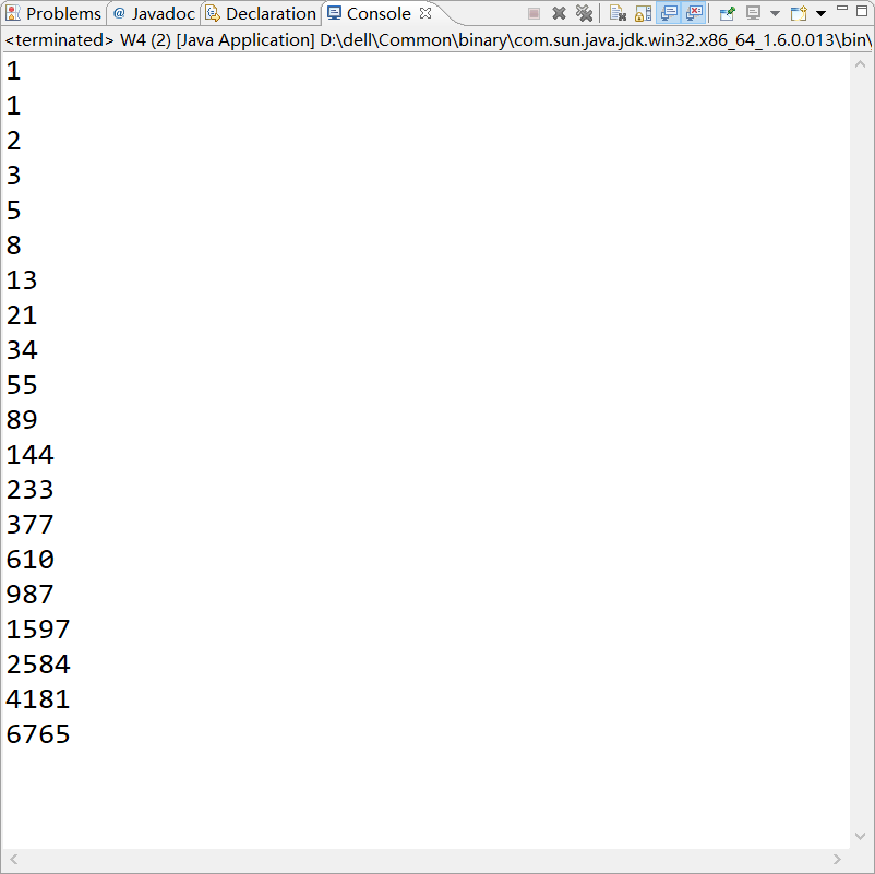 package week8; public class W4 { /** * @param args */ public static void main(String[] args) { // TODO Auto-generated method stub int a[]=new int [20]; a[0]=1; int x=1; int y=1; int sum=1; for (int i = 1; i < a.length; i++) { a[i]=sum; sum=x+y; x=y; y=sum; } for (int i = 0; i < a.length; i++) { System.out.println(a[i]+" "); } } }