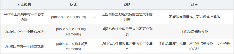 1 import java.util.Arrays; 2 import java.util.List; 3 import java.util.Set; 4 5 /* 6 Arrays工具类中有一个静态方法: 7 8 - public static <T> List<T> asList(T... a):返回由指定数组支持的固定大小的列表 9 10 List接口中有一个静态方法: 11 12 - public static <E> List<E> of(E... elements):返回包含任意数量元素的不可变列表 13 14 Set接口中有一个静态方法: 15 16 - public static <E> Set<E> of(E... elements):返回包含任意数量元素的不可变集合 17 */ 18 19 public class ArgsDemo2 { 20 public static void main(String[] args) { 21 22 //public static <T> List<T> asList(T... a):返回由指定数组支持的固定大小的列表 23 List<String> list = Arrays.asList("hello","world","java"); 24 25 // list.add("javaee");//UnsupportedOperationException:不支持请求操作 26 // list.remove("world");//UnsupportedOperationException 27 list.set(1,"javaee");//添加和删除都会修改List的大小,所以不可以用,修改不会改变大小,可以用 28 System.out.println(list); 29 30 31 32 //public static <E> List<E> of(E... elements):返回包含任意数量元素的不可变列表 33 List<String> list = List.of("hello","world","java","world"); 34 35 // list.add("javaee");//UnsupportedOperationException 36 // list.remove("world");//UnsupportedOperationException 37 // list.set(1,"javaee");//UnsupportedOperationException 38 //增删改都不可以 39 System.out.println(list); 40 41 42 43 //public static <E> Set<E> of(E... elements):返回包含任意数量元素的不可变集合 44 Set<String> set = Set.of("hello","world","java"); 45 // Set<String> set = Set.of("hello","world","java","world");//IllegalArgumentException:非法或不正确的参数 46 //因为set不能有重复元素 47 48 // set.add("javaee");//UnsupportedOperationException 49 // set.remove("world");//UnsupportedOperationException 50 System.out.println(set); 51 52 } 53 }