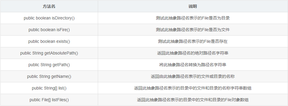 1 import java.io.File; 2 import java.io.IOException; 3 4 /* 5 File类判断和获取功能** 6 7 public boolean isDirectory() 测试此抽象路径名表示的File是否为目录 8 public boolean isFire()测试此抽象路径名表示的File是否为文件 9 public boolean exists()测试此抽象路径名表示的File是否存在 10 11 public String getAbsolutePath()返回此抽象路径名的绝对路径名字符串 12 public String getPath()将此抽象路径名转换为路径名字符串 13 public String getName()返回由此抽象路径名表示的文件或目录的名称 14 15 public String[] list()返回此抽象路径名表示的目录中的文件和目录的名称字符串数组 16 public File[] listFiles()返回此抽象路径名表示的目录中的文件和目录的File对象数组 17 18 */ 19 20 public class FileDemo2 { 21 public static void main(String[] args) throws IOException { 22 //创建一个file对象 23 File f = new File("java.txt"); 24 // System.out.println(f.createNewFile()); 25 26 // public boolean isDirectory() 测试此抽象路径名表示的File是否为目录 27 // public boolean isFire()测试此抽象路径名表示的File是否为文件 28 // public boolean exists()测试此抽象路径名表示的File是否存在 29 System.out.println(f.isDirectory()); 30 System.out.println(f.isFile()); 31 System.out.println(f.exists()); 32 /*运行结果: 33 false 34 true 35 true 36 */ 37 38 // public String getAbsolutePath()返回此抽象路径名的绝对路径名字符串 39 // public String getPath()将此抽象路径名转换为路径名字符串 40 // public String getName()返回由此抽象路径名表示的文件或目录的名称 41 System.out.println(f.getAbsolutePath()); 42 System.out.println(f.getPath()); 43 System.out.println(f.getName()); 44 /*运行结果: 45 F:\Users\ASUS\eclipse-workspace\hello java\java.txt 46 java.txt//封装的路径 47 java.txt//路径的名称 48 */ 49 50 System.out.println("---------"); 51 // public String[] list()返回此抽象路径名表示的目录中的文件和目录的名称字符串数组 52 // public File[] listFiles()返回此抽象路径名表示的目录中的文件和目录的File对象数组 53 File f2 = new File("E:itcast"); 54 String[] strArray = f2.list(); 55 for (String str : strArray) { 56 System.out.println(str); 57 } 58 System.out.println("---------"); 59 File[] fileArray = f2.listFiles(); 60 for (File file : fileArray) { 61 // System.out.println(file); 62 // System.out.println(file.getName()); 63 if (file.isFile()) {//如果是文件就输出名称 64 System.out.println(file.getName()); 65 } 66 67 } 68 69 } 70 }