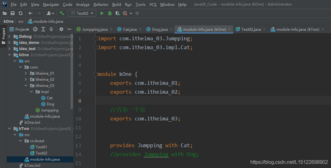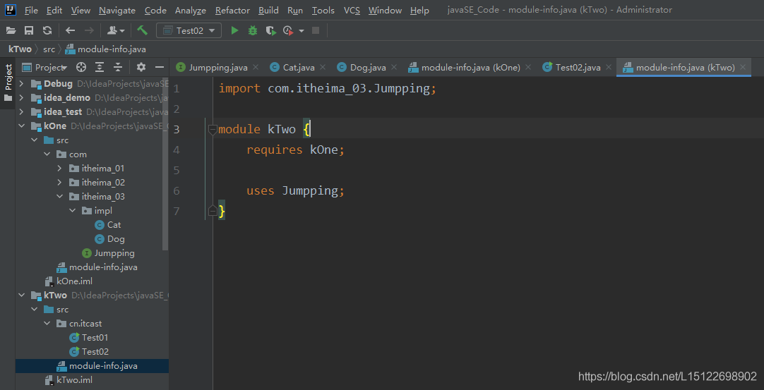 3. 在kTwo模块中修改module-info.java文件,添加以下内容