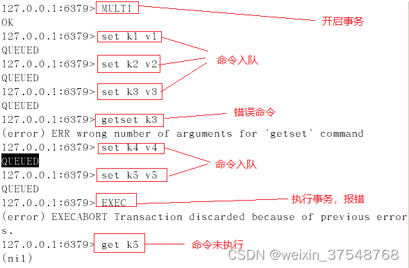 (3)若在事务队列中存在命令性错误(类似于java编译性错误),则执行EXEC命令时,所有命令都不会执行