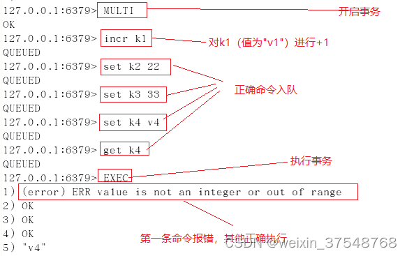 (4)若在事务队列中存在语法性错误(类似于java的1/0的运行时异常),则执行EXEC命令时,其他正确命令会被执行,错误命令抛出异常。
