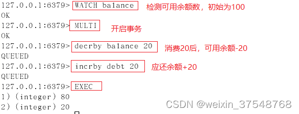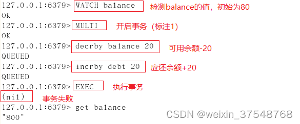 案例二:使用watch检测balance,在开启事务后(标注1处),在新窗口执行标注2中的操作,更改balance的值,模拟其他客户端在事务执行期间更改watch监控的数据,然后再执行标注1后命令,执行EXEC后,事务未成功执行。