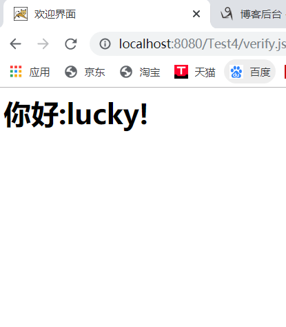 <%@ page language="java" import="java.util.*" pageEncoding="utf-8"%> <% String path = request.getContextPath(); String basePath = request.getScheme()+"://"+request.getServerName()+":"+request.getServerPort()+path+"/"; %> <!DOCTYPE HTML PUBLIC "-//W3C//DTD HTML 4.01 Transitional//EN"> <html> <head> <base href="<%=basePath%>"> <title>欢迎界面</title> <meta http-equiv="pragma" content="no-cache"> <meta http-equiv="cache-control" content="no-cache"> <meta http-equiv="expires" content="0"> <meta http-equiv="keywords" content="keyword1,keyword2,keyword3"> <meta http-equiv="description" content="This is my page"> <!-- <link rel="stylesheet" type="text/css" href="styles.css"> --> </head> <body> <h1>你好:lucky!</h1> </body> </html>