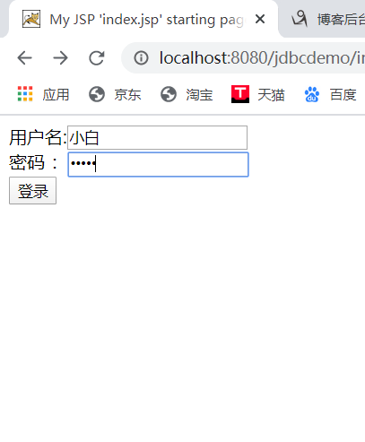 <%@ page language="java" import="java.util.*" pageEncoding="utf-8"%> <% String path = request.getContextPath(); String basePath = request.getScheme()+"://"+request.getServerName()+":"+request.getServerPort()+path+"/"; %> <!DOCTYPE HTML PUBLIC "-//W3C//DTD HTML 4.01 Transitional//EN"> <html> <head> <base href="<%=basePath%>"> <title>My JSP 'index.jsp' starting page</title> <meta http-equiv="pragma" content="no-cache"> <meta http-equiv="cache-control" content="no-cache"> <meta http-equiv="expires" content="0"> <meta http-equiv="keywords" content="keyword1,keyword2,keyword3"> <meta http-equiv="description" content="This is my page"> <!-- <link rel="stylesheet" type="text/css" href="styles.css"> --> </head> <body> <form action="dologin.jsp" method="post"> 用户名:<input type="text" name="uname" value="小白" /><Br> 密码 :<input type="password" name="upwd" value="88888"/><br> <input type="submit" value="登录"> </form> </body> </html>