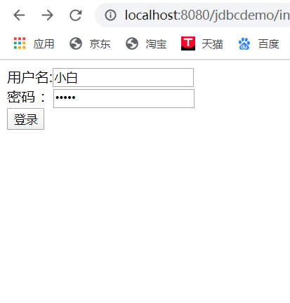 <%@ page language="java" import="java.util.*" pageEncoding="utf-8"%> <% String path = request.getContextPath(); String basePath = request.getScheme()+"://"+request.getServerName()+":"+request.getServerPort()+path+"/"; %> <!DOCTYPE HTML PUBLIC "-//W3C//DTD HTML 4.01 Transitional//EN"> <html> <head> <base href="<%=basePath%>"> <title>My JSP 'index.jsp' starting page</title> <meta http-equiv="pragma" content="no-cache"> <meta http-equiv="cache-control" content="no-cache"> <meta http-equiv="expires" content="0"> <meta http-equiv="keywords" content="keyword1,keyword2,keyword3"> <meta http-equiv="description" content="This is my page"> <!-- <link rel="stylesheet" type="text/css" href="styles.css"> --> </head> <body> <form action="dologin.jsp" method="post"> 用户名:<input type="text" name="uname" value="小白" /><Br> 密码 :<input type="password" name="upwd" value="88888"/><br> <input type="submit" value="登录"> </form> </body> </html>