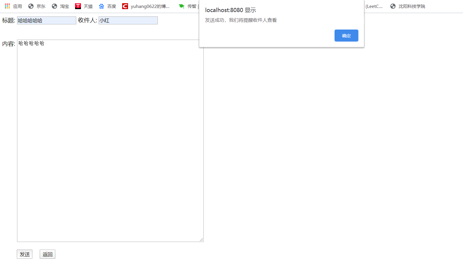 <%@ page language="java" import="java.util.*" pageEncoding="utf-8"%> <%@page import="com.gd.dao.UsersDao"%> <% String path = request.getContextPath(); String basePath = request.getScheme() + "://" + request.getServerName() + ":" + request.getServerPort() + path + "/"; %> <!DOCTYPE HTML PUBLIC "-//W3C//DTD HTML 4.01 Transitional//EN"> <html> <head> <base href="<%=basePath%>"> <title>My JSP 'write.jsp' starting page</title> <style type="text/css"> textarea{ vertical-align: top; } #a1{ margin-left:40px; } #a2{ margin-left:15px; } </style> <meta http-equiv="pragma" content="no-cache"> <meta http-equiv="cache-control" content="no-cache"> <meta http-equiv="expires" content="0"> <meta http-equiv="keywords" content="keyword1,keyword2,keyword3"> <meta http-equiv="description" content="This is my page"> <!-- <link rel="stylesheet" type="text/css" href="styles.css"> --> <script> function a(){ alert("发送成功,我们将提醒收件人查看"); } function b(){ window.location="dologin.jsp"; } </script> </head> <body> <form action="writecon.jsp"> 标题: <input type="text" name="utitle" /> 收件人: <input type="text" name="uname" /> <br> <br> <br> 内容: <textarea cols="68" rows="38" name="con"></textarea> <br> <br> <input type="submit" value="发送" id="a1" onclick="a()"/> <input type="button" value="返回" id="a2" onclick="b()"/> </form> </body> </html>