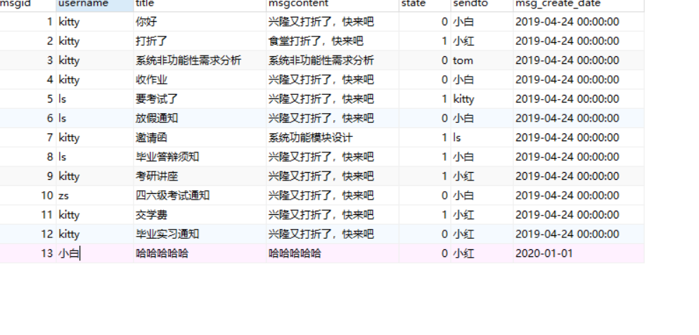 <%@ page language="java" import="java.util.*" pageEncoding="utf-8"%> <%@page import="com.gd.dao.MsgDao"%> <%@page import="com.gd.entity.Msg"%> <% String path = request.getContextPath(); String basePath = request.getScheme()+"://"+request.getServerName()+":"+request.getServerPort()+path+"/"; %> <% request.setCharacterEncoding("utf-8"); String uname = request.getParameter("uname"); String utitle = request.getParameter("utitle"); String con = request.getParameter("con"); Msg msg=new Msg(); msg.setUsernname("小白"); msg.setTitle(utitle); msg.setMsgcontent(con); msg.setState(0); msg.setSendto(uname); msg.setMsgid(13); msg.setMsgcreatedate("2020-01-01"); MsgDao md=new MsgDao(); md.Insert(msg); %>