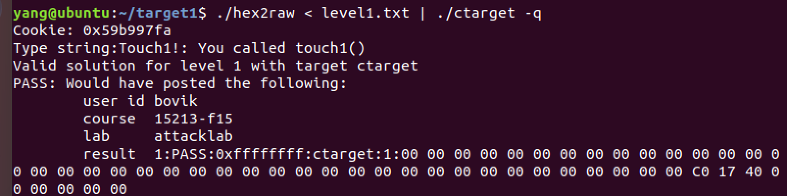ubuntu是小端存储,所以我们必须把低位先放入栈中,这样level 1就完成了