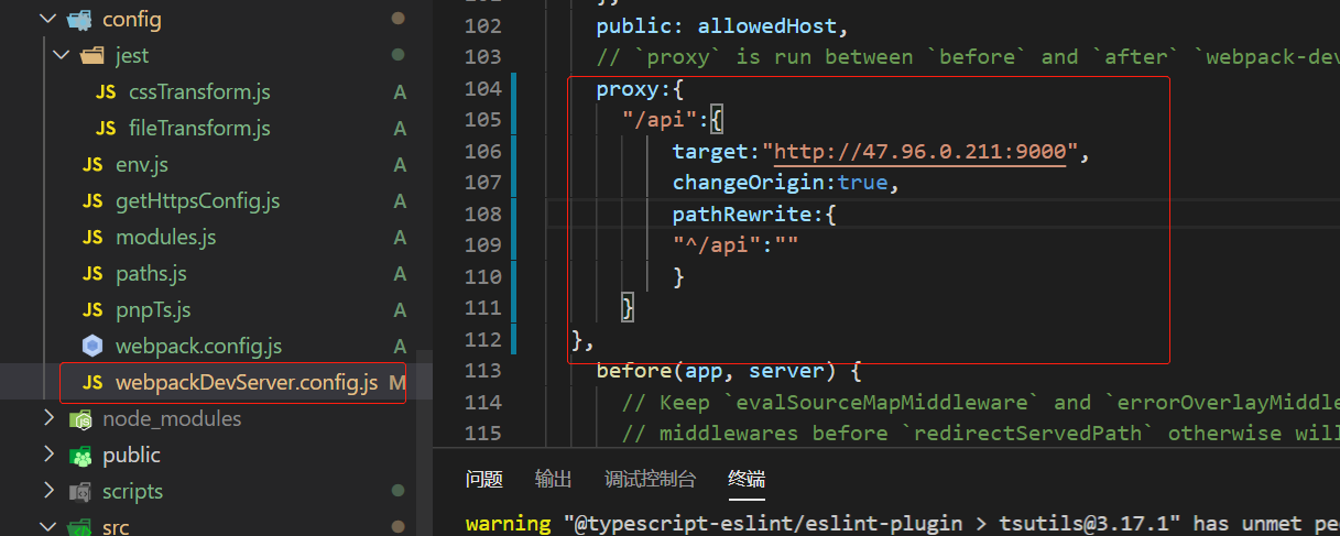 再去控制台输入命令 yarn eject Y ,抽离出来后,出现了如下所示的文件夹:在下图中标红的部分进行代理配置
