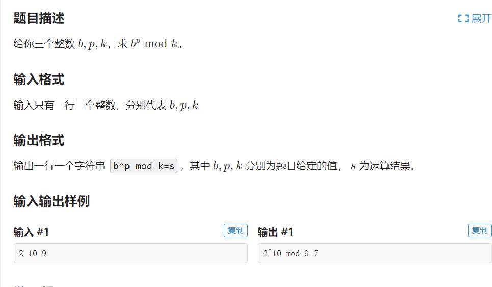 printf("%d^%d mod %d=%lld",b,p,k,qpow(b,p,k));