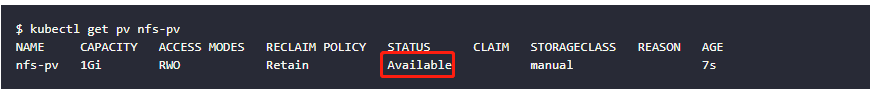 1、首先创建个pv,这里用的后端存储是nfs。当刚创建好的pv状态必然是Available的,表示可以被pvc绑定。