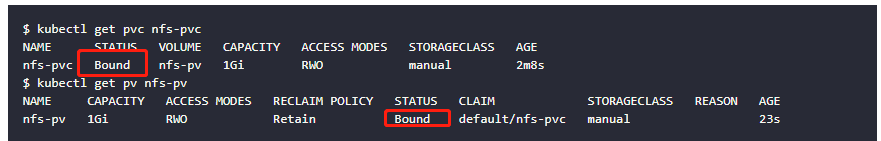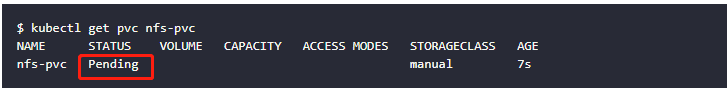 刚添加的 PVC 状态是 Pending,如果有合适的 PV,这个 Pending 状态会立刻变为 Bound 状态,同时相应的 PVC 也会变为 Bound,PVC 和 PV 进行了绑定。 我们可以先添加 PVC,后添加 PV,这样就能保证看到 Pending 状态。