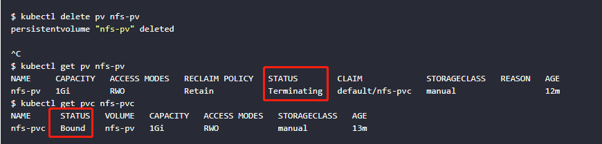 现在的pvc与pv是在绑定状态了,均为bound。如不小心删了pv会有什么反应?