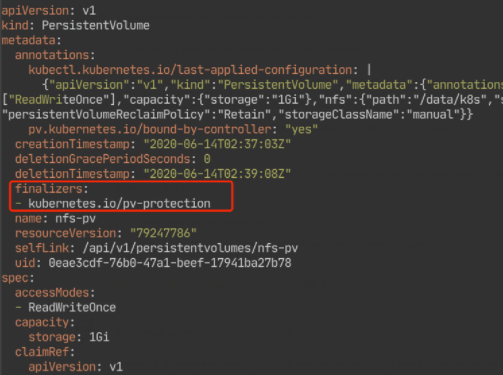 我们可以通过编辑 PV,删除 PV 中的 finalizers 属性来强制删除 PV: