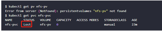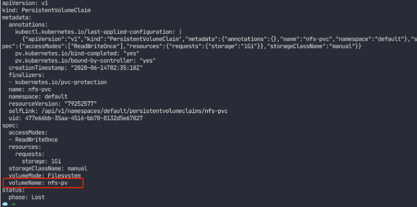 当pvc是Lost时,说明之前已经绑定的pv已经没有了,但是pvc里还有着pv的绑定信息,可以导看看情况