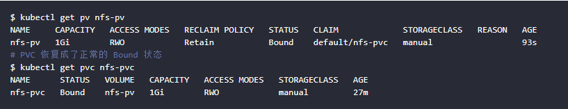 要解决这个问题,就把之前创建的pv重新创建出来即可。创建完成后,pv pvc的状态都恢复成bound状态了。