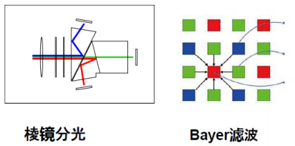 彩色相机分为棱镜分光和Bayer滤波相机两种。