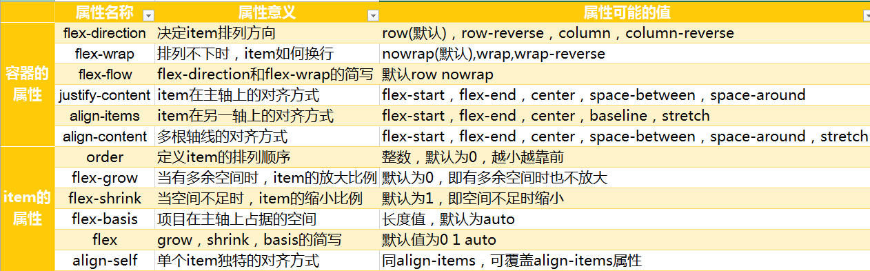 下图是关于flex的属性总结表,后面会详细介绍每个属性的意义和用法: