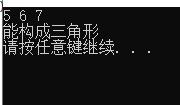 1 #include<stdio.h> 2 #include<stdlib.h> 3 int main() 4 { 5 float a,b,c; 6 scanf("%f%f%f",&a,&b,&c); 7 8 if(a+b>c&&a+c>b&&b+c>a) 9 printf("能构成三角形\n"); 10 else 11 printf("不能构成三角形\n"); 12 13 system("pause"); 14 15 return 0; 16 }