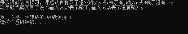 1 #include<stdio.h> 2 #include<stdlib.h> 3 int main() 4 { 5 char ans1,ans2; 6 printf("每次课前认真预习,课后认真复习了没?(输入y或Y表示有,输入n或N表示没有):"); 7 ans1=getchar(); 8 getchar(); 9 printf("动手敲代码实践了没?(输入y或Y表示敲了,输入n或N表示没有敲):"); 10 ans2=getchar(); 11 if(ans1=ans2='Y'||'y') 12 printf("\n罗马不是一天建成的,继续保持:)\n"); 13 else 14 printf("\n罗马不是一天毁败的:)\n"); 15 system("pause"); 16 return 0; 17 }