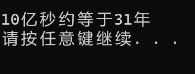 1 #include<stdio.h> 2 int main() 3 { 4 int year; 5 int sec=1000000000; 6 year=sec/31536000; 7 printf("10亿秒约等于%d年\n",year); 8 return 0; 9 }