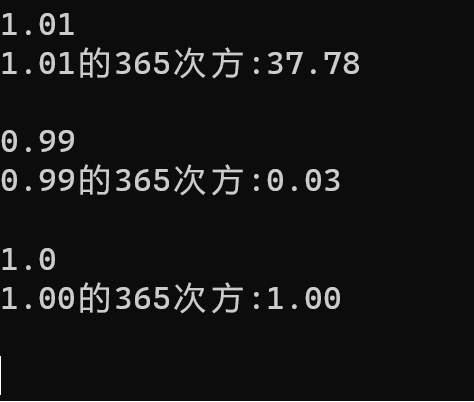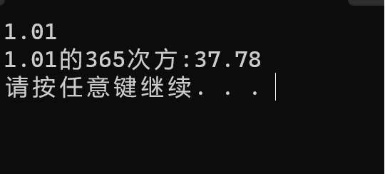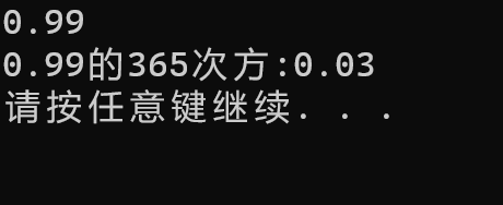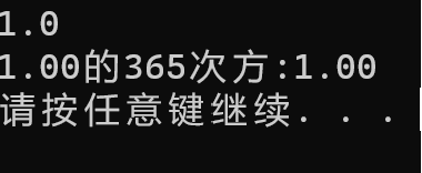 1 #include<stdio.h> 2 #include<math.h> 3 4 int main() 5 { 6 double x,ans; 7 8 while(scanf("%lf",&x)!= EOF) 9 { 10 ans=pow(x,365); 11 printf("%.2f的365次方:%.2f\n",x,ans); 12 printf("\n"); 13 } 14 15 return 0; 16 }