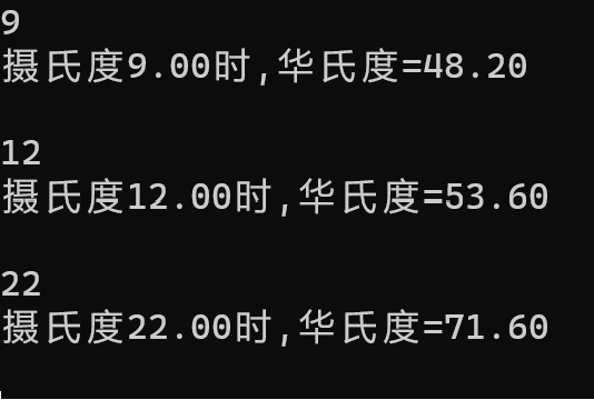 1 #include<stdio.h> 2 #include<math.h> 3 int main() 4 { 5 double C,F; 6 while(scanf("%lf",&C)!=EOF) 7 { 8 F=1.8*C+32; 9 printf("摄氏度%.2lf时,华氏度=%.2f\n",C,F); 10 printf("\n"); 11 } 12 return 0; 13 }