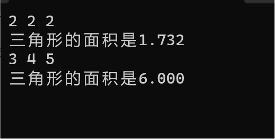 1 #include<stdio.h> 2 #include<math.h> 3 4 int main() 5 { 6 double a,b,c,p,s; 7 while(scanf("%lf%lf%lf",&a,&b,&c)!=EOF) 8 { 9 p=(a+b+c)/2; 10 s=sqrt(p*(p-a)*(p-b)*(p-c)); 11 printf("三角形的面积是%.3f",s); 12 printf("\n"); 13 } 14 return 0; 15 }
